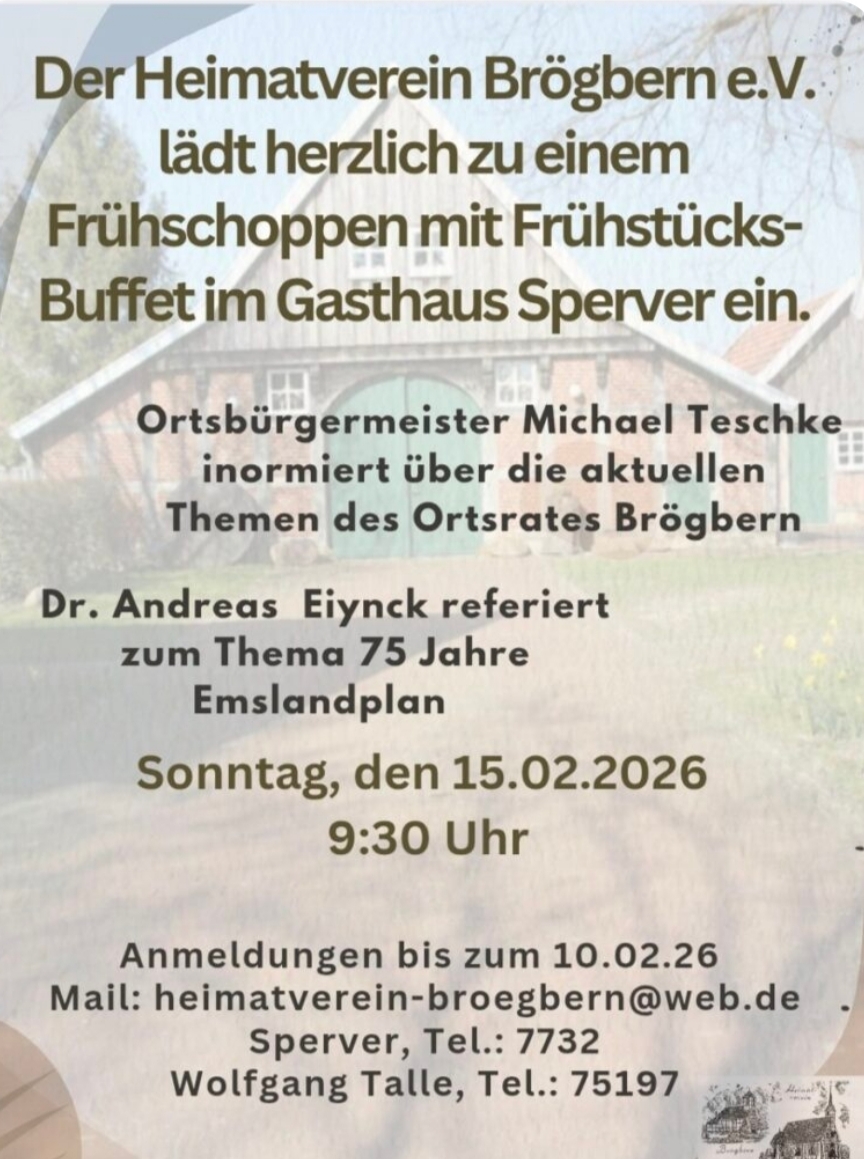 Der Heimatverein Brögbern lädt zum Frühschoppen in Gasthaus Sperver am 15.02.2026 um 9.30 Uhr ein. Dr. Andreas Eiynck wird zum Thema: 75 Jahre Emslandplan berichten. Auch wird der Ortsbürgermeister Michael Teschke einen kurzen Bericht über Brögbern 2025 und 2026 geben. In den letzten Jahren war der Frühschoppen immer gut besucht mit über 100 Personen. Melden Sie sich noch schnell an.